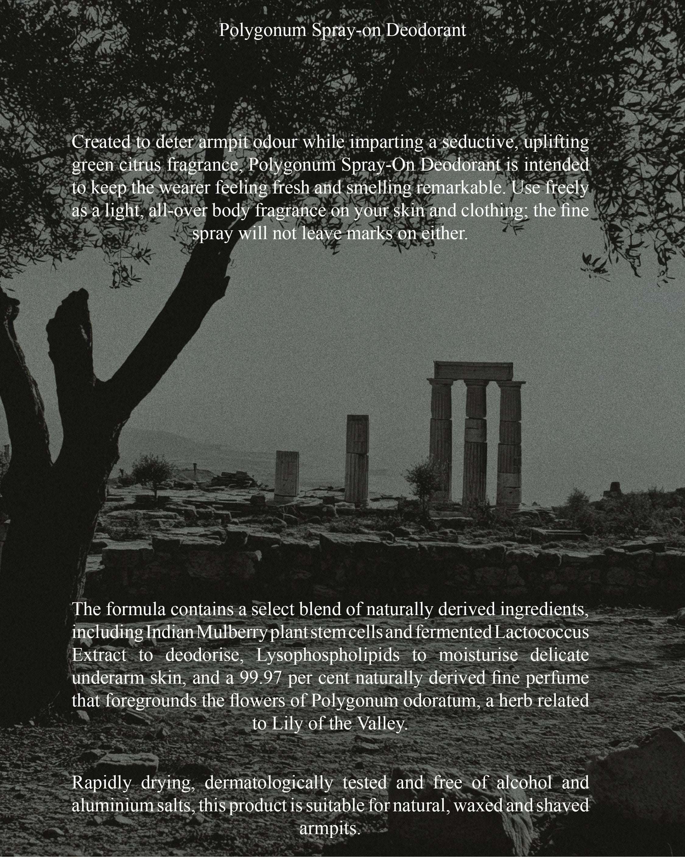 Dermatologically tested and free from aluminium salts, both our Polygonum and Marjoram deodorants are suitable for natural, waxed and shaved armpits alike, and for sensitive skin. Because the skin microbiome takes up to three days to adjust to changes in bacterial activity, begin with frequent, liberal application.