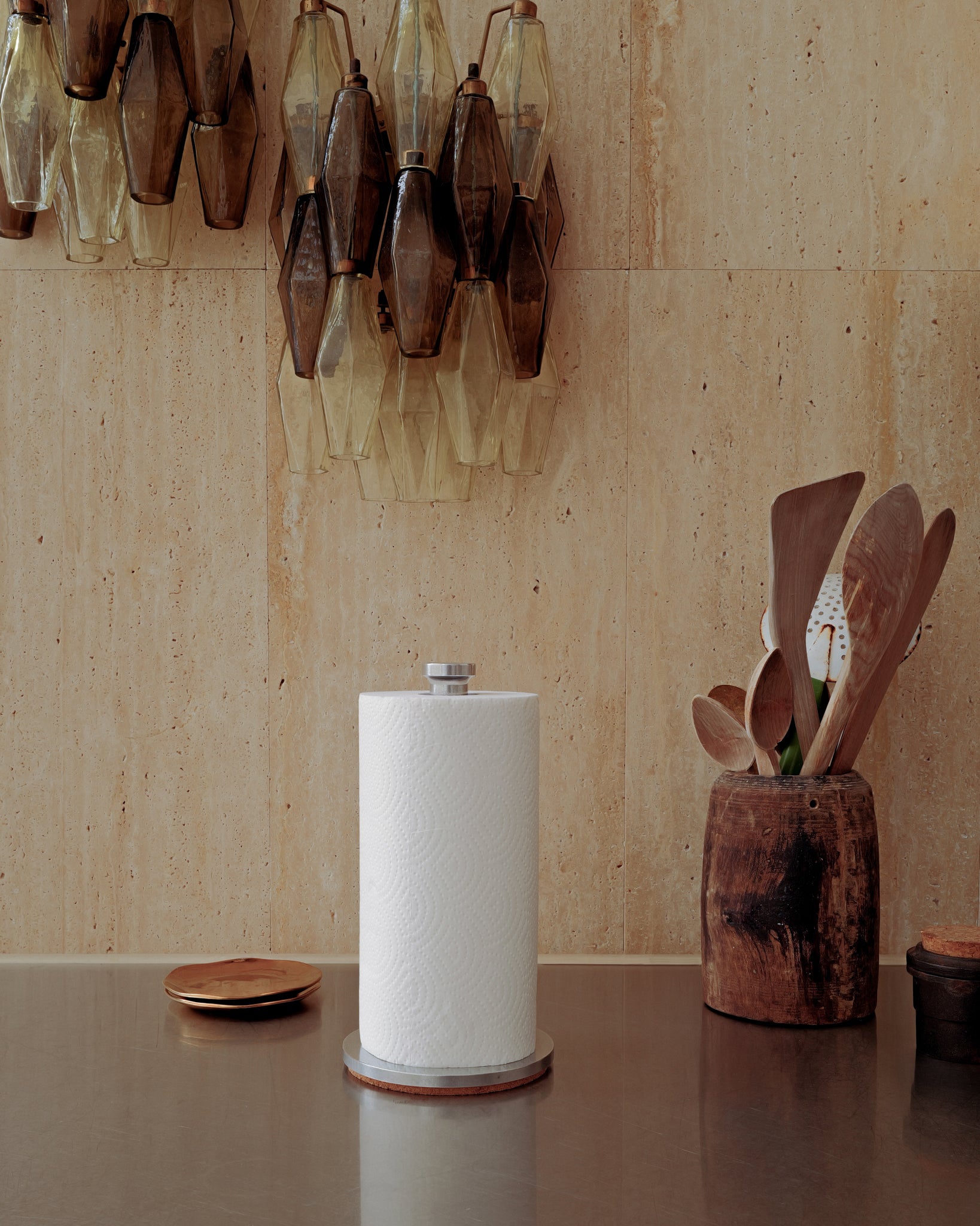 A paper roll holder for the kitchen or bathroom. Cut from solid aluminium, rumble polished. A natural cork base protects surfaces and keeps it steady where you put it. In the kitchen, it holds a single paper roll. In the bathroom, it stacks up to three spare toilet rolls within easy reach. The aluminium is unsealed—small variations from the rumble polish are part of the finish, not flaws.