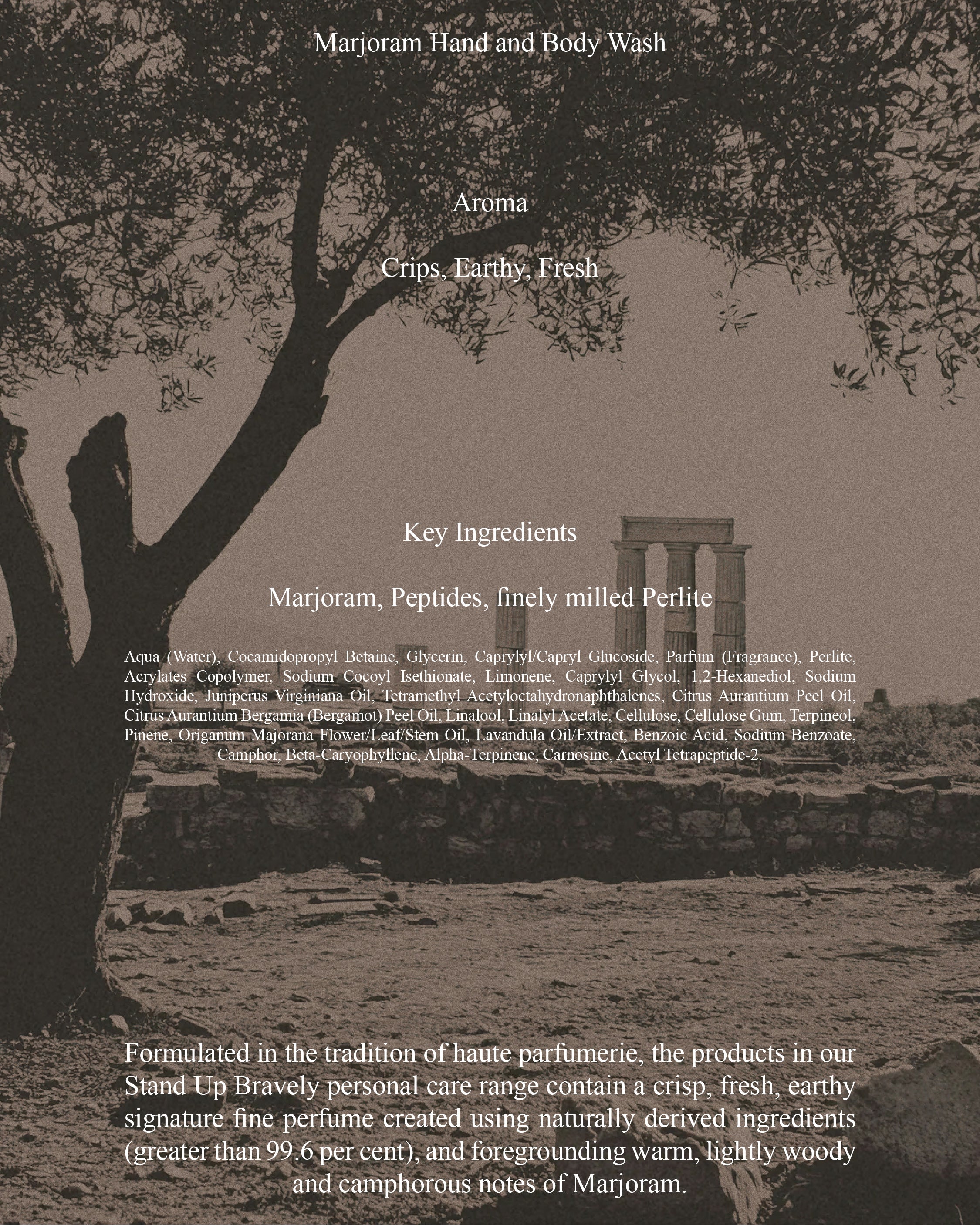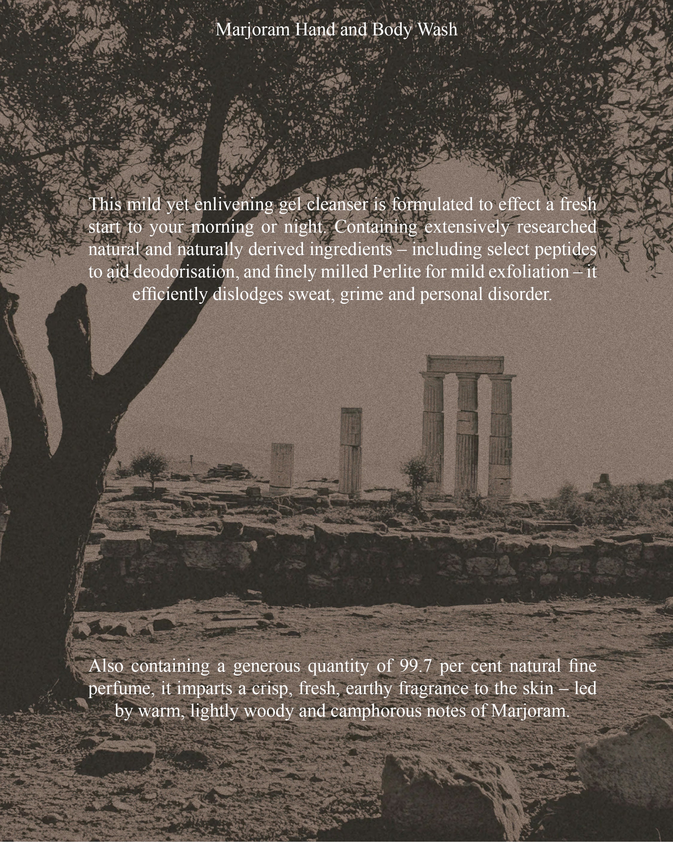 Our Hand & Body Wash is a mild yet enlivening gel cleanser, formulated to effect a fresh start to your morning or night. Containing extensively researched natural and naturally derived ingredients – including select peptides to aid deodorisation, and finely milled Perlite for mild exfoliation – it efficiently dislodges sweat, grime and personal disorder.